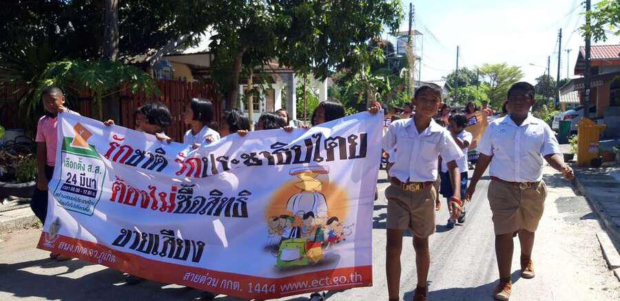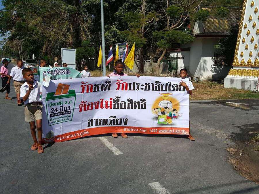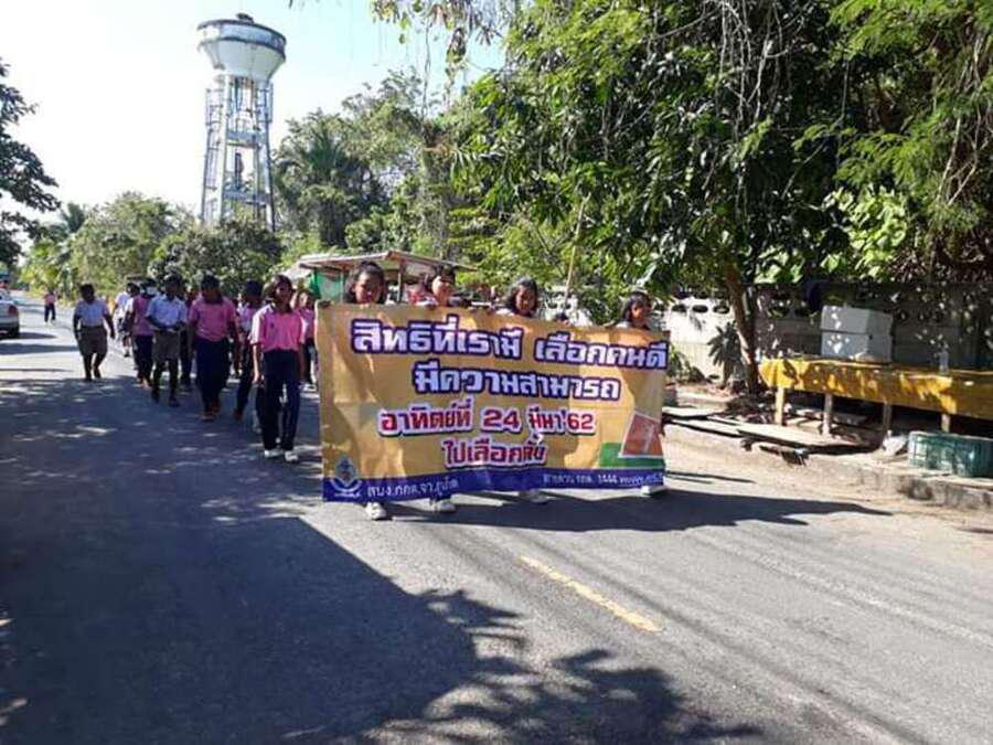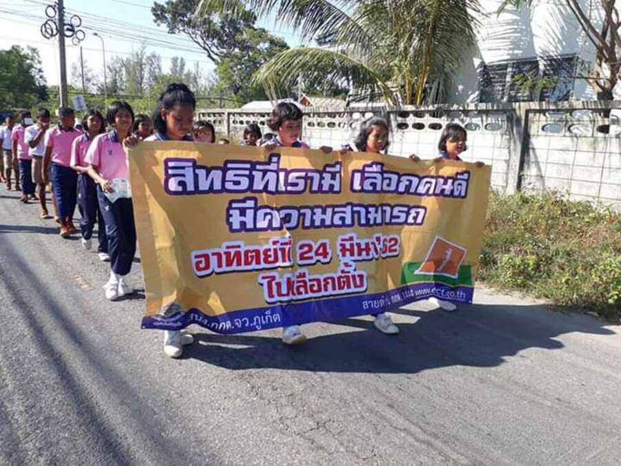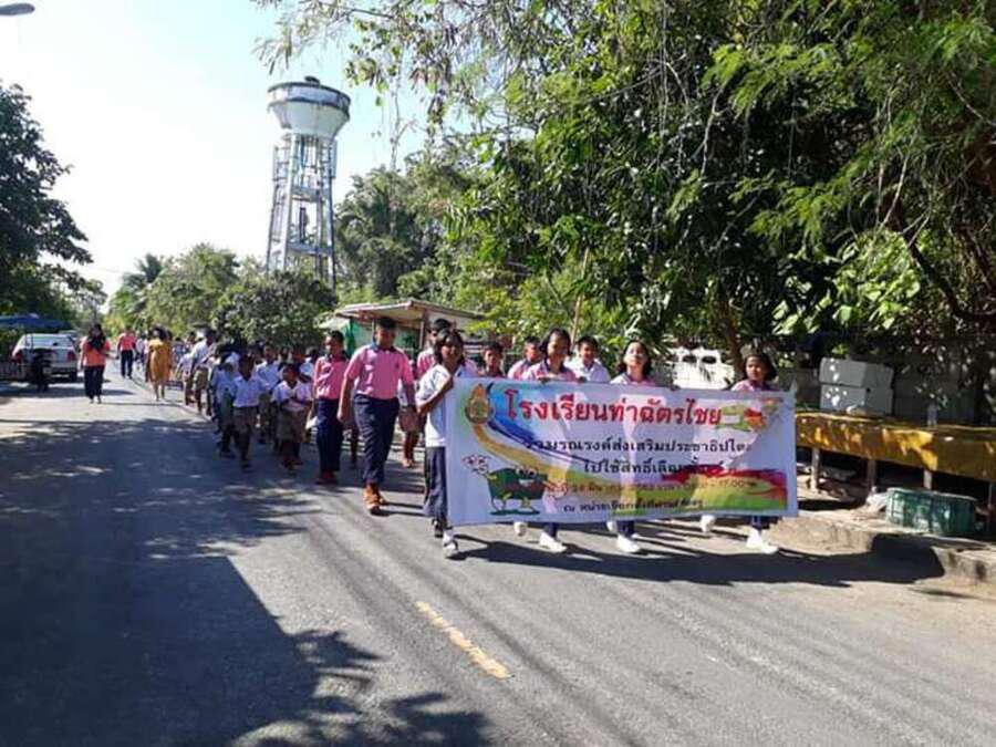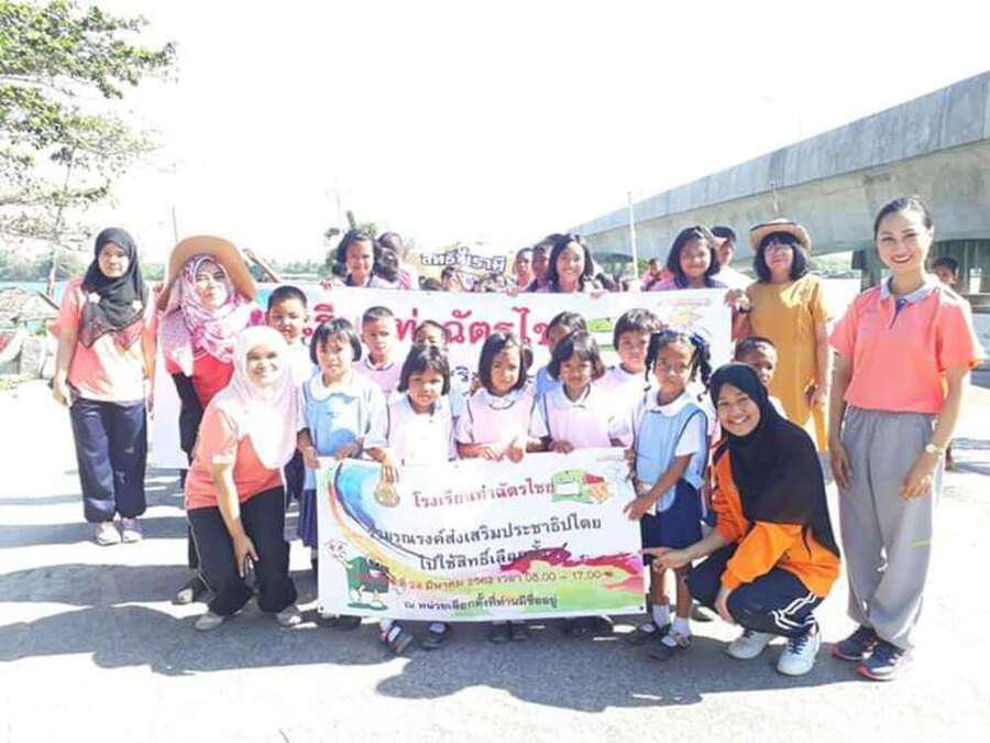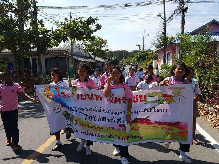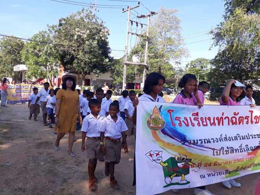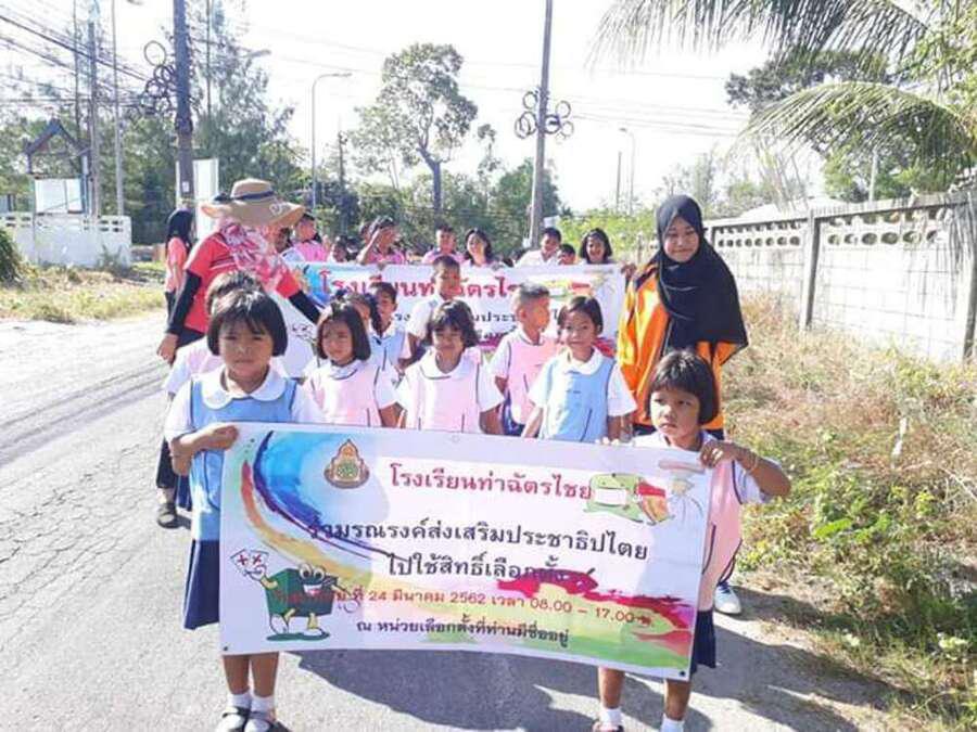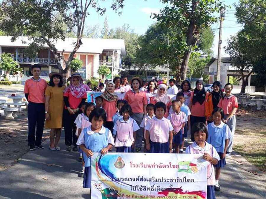 วันที่ ึ7 มีนาคม 2562 คณะครูและนักเรียนชั้นอนุบาลปีที่ 2 ถึงชั้นประถมศึกษาปีที่ 6 ของโรงเรียนท่าฉัตรไชย ร่วมเดินรณรงค์การเลือกตั้ง 2562 ในวันที่ 24 มีนาคม 2562 ณ หมู่บ้านท่าฉัตรไชย ตำบลไม้ขาว อำเภอถลาง จังหวัดภูเก็ต S:0